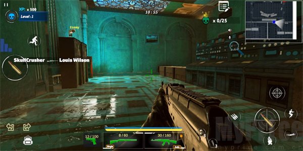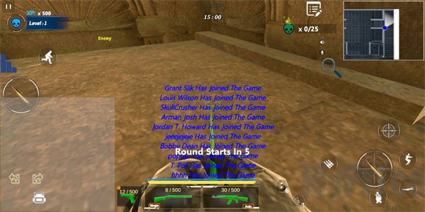 虚拟按键负责移动与射击操作,射击、换弹、下蹲和趴伏切换顺畅