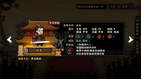 常规步兵兵种,生命成长为2.64,攻击成长为0.108,防御成长0.0432,自带兵法效果为:开战时:每有1个兵种出战,刘秀5秒内逐渐提升14士气。若刘秀士气曾达到100:将1张【劝降】加入牌库,否则,刘秀攻击、格挡+28%